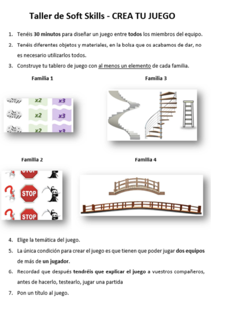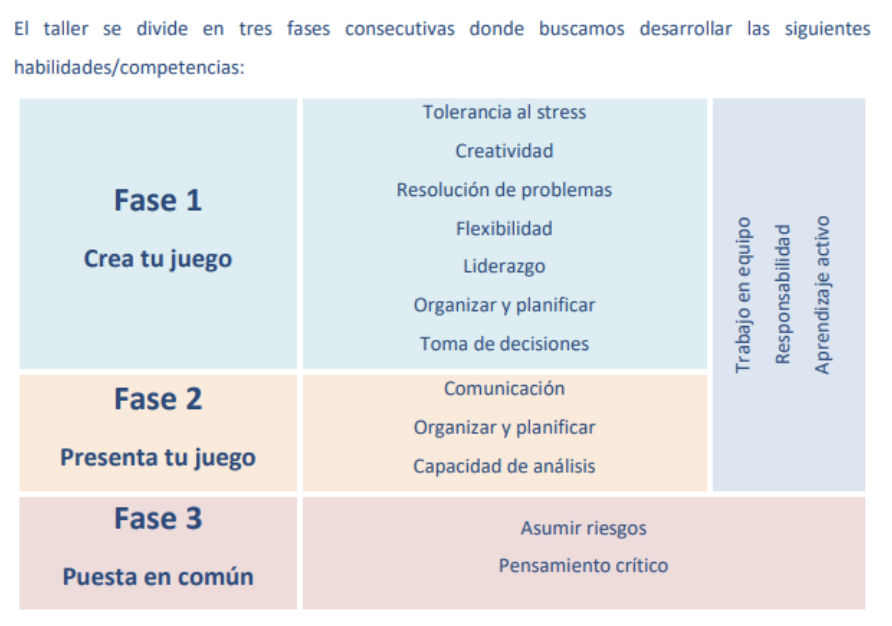 Metodología: Dividiremos al alumnado en grupo y les proporcionaremos un tablero, materiales e instrucciones para que inventen un juego de mesa. Posteriormente tendrán que explicarlo al resto de los grupos que comentarán propuesta o mejoras. Se jugará una partida con las bases del juego elegido y finalmente todo el grupo descubrirán y relacionaran todas las competencias que han ido desarrollando durante la actividad. Espacio: Este taller que requiere participación continúa de los alumnos y poder disponer de espacio para poder trabajar en equipos.